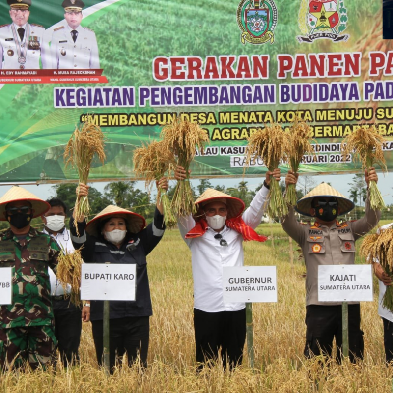 waroengberita.com – Karo | Gubernur Sumatera Utara (Sumut) Edy Rahmayadi bersama anggota Forkopimda melakukan panen raya padi bersama petani Desa Lau Kasumpat, di persawahan Jalan Besar Medan-Kota Cane, Kecamatan Mardinding, Kabupaten Karo, Rabu (16/2). Panen pada areal persawahan seluas 280 hektare tersebut menggunakan tiga jenis varietas padi unggul yakni Mekongga, Inpari 32 dan Ciherang.
