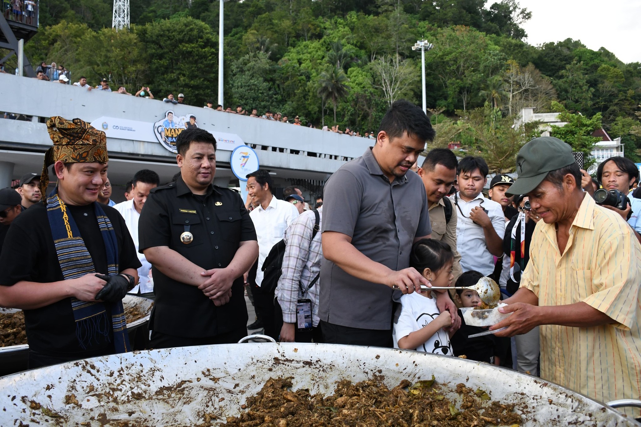 Acara “Mangan Baggal” menghadirkan YouTuber kuliner ternama Bobon Santoso, yang secara langsung memasak hidangan super jumbo khas Sumatera Utara menggunakan bumbu andaliman — rempah khas Batak yang menjadi ikon rasa daerah ini. Kegiatan ini disambut antusias oleh masyarakat; lebih dari 1.000 pengunjung memadati Pantai Bebas Parapat untuk menyaksikan Gubernur Bobby Nasution dan Bobon Santoso memasak lebih dari 200 kilogram ayam berbumbu andaliman.