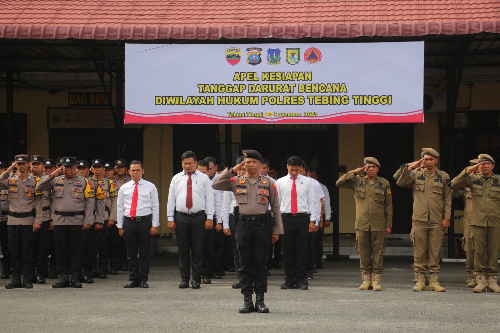 WaroengBerita.com – Tebing Tinggi |Dalam upaya memperkuat kesiapsiagaan personel dan sarana pendukung menghadapi ancaman bencana alam, Polres Tebing Tinggi menggelar Apel Kesiapan Tanggap Darurat Bencana, Rabu (5/11/2025), di Lapangan Apel Mapolres Tebing Tinggi. Kegiatan ini dipimpin langsung oleh Kapolres Tebing Tinggi AKBP Drs. Simon Paulus Sinulingga, S.H., dan diikuti oleh seluruh unsur lintas sektor.