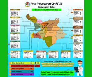 Angka pasien Covid-19 di Toba akhir-akhir ini terus meningkat. Pada update peta persebaran per tanggal 18 Februari 2022, tercatat kasus aktif sebanyak 246 orang yang keadaannya dirawat di sejumlah rumah sakit dan sebagian besar menjalani isolasi mandiri.