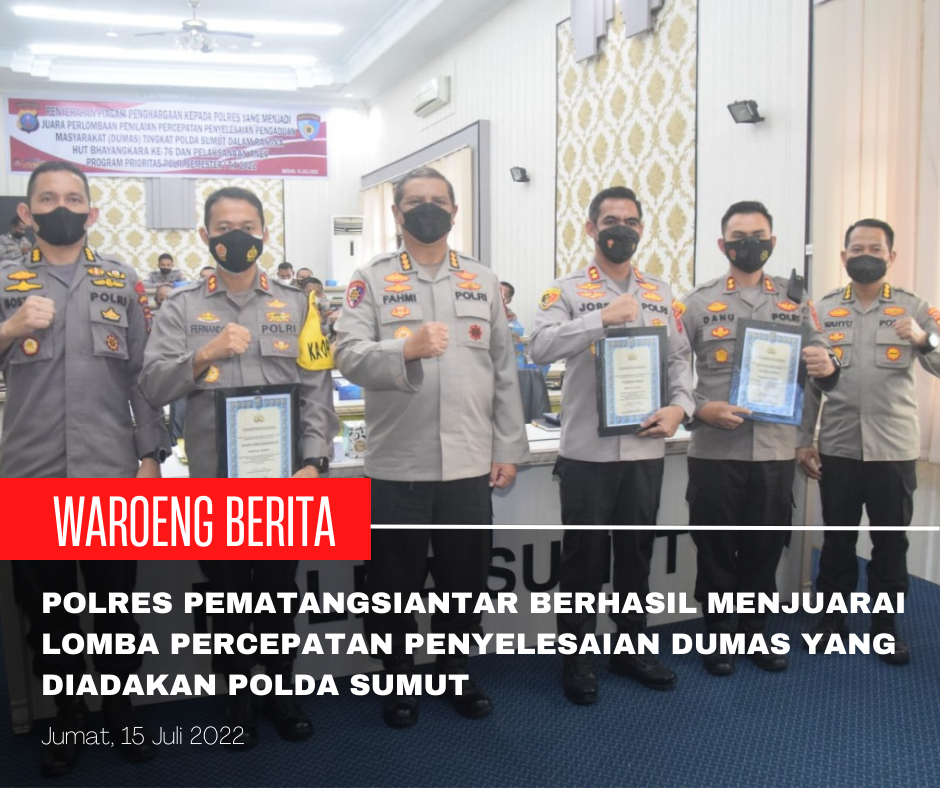 waroengberita.com – Pematangsiantar | Bertempat di Ruang lantai 4 Polda Sumut, Kapolres Pematangsiantar AKBP Fernando SH, SIK Menerima Piagam Juara 1 (Satu) Perlombaan Percepatan Penyelesaian Dumas yang diadakan Polda Sumut dalam rangka menyambut HUT Bhayangkara ke-76, Jumat (15 Juli 2022).