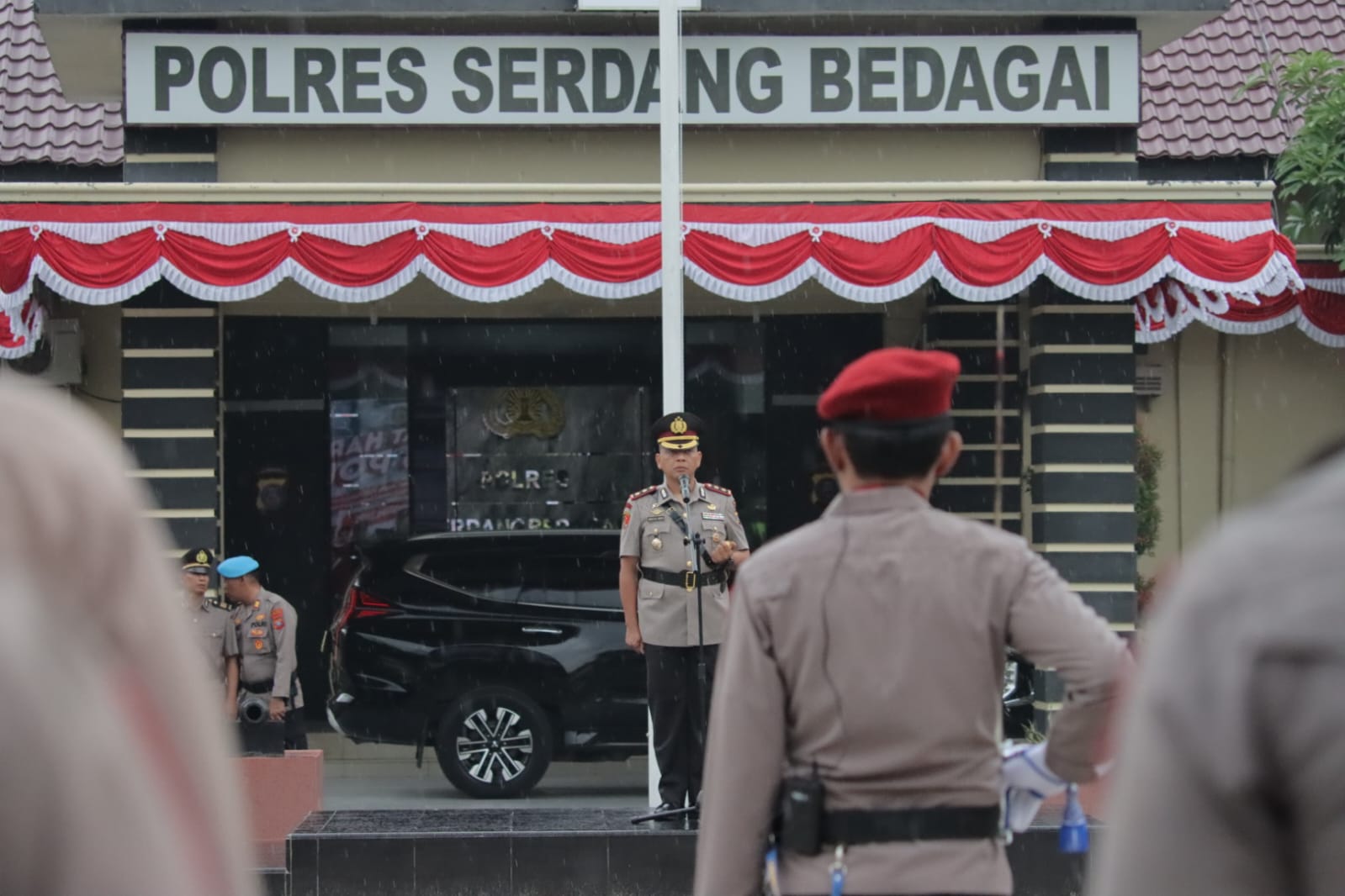 WaroengBerita.com – Sergai | Peringatan Hari Juang Polri di Polres Serdang Bedagai berlangsung khidmat meski diguyur rintik hujan. Upacara digelar di halaman Mako Polres Sergai pada Kamis (21/8/2025) dengan Kapolres Sergai, AKBP Jhon Sitepu, S.I.K., M.H., bertindak sebagai Inspektur Upacara.